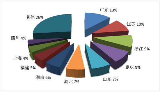 第三季度旅行社國內(nèi)旅游組織人次排名前十位的地區(qū)由高到低依次為廣東、江蘇、浙江、重慶、山東、湖北、湖南、福建、上海、四川(見圖3)。