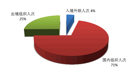按照入境外聯(lián)人次、國內(nèi)組織人次、出境組織人次三項指標(biāo),入境旅游、國內(nèi)旅游、出境旅游市場人次所占份額依次為4%、71%和25%(見圖6)。